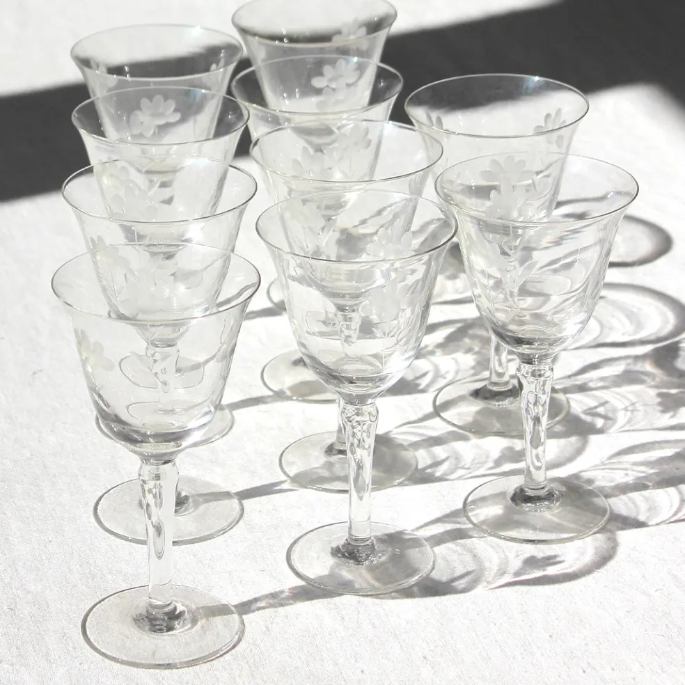 Série de dix verres fins délicatement gravés de marguerites. Les coupes à champagne du même service ainsi qu’une carafe sont disponibles sur notre site.