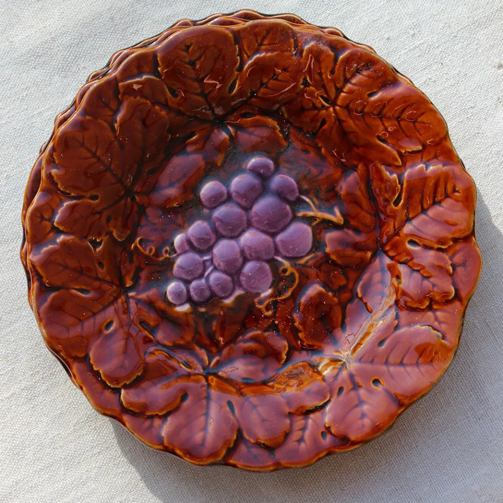 Ensemble d’assiettes à dessert en barbotine. Chaque assiette porte un fruit différent. Charmant modèle des années 50 signé Digoin Sarreguemines.