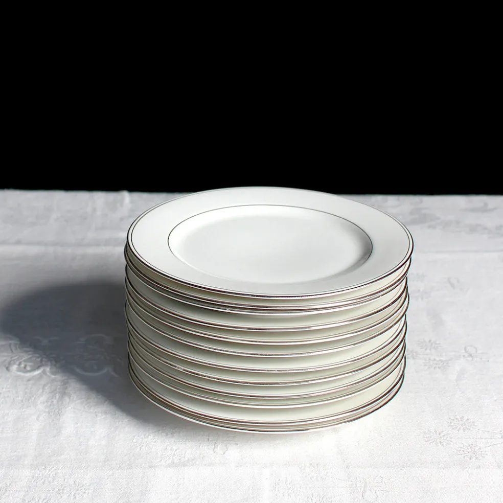 Série de 12 assiettes à dessert dans une porcelaine blanche cerclée d’un liseré argenté. Modèle fin et délicat pour les fêtes de fin d’année.