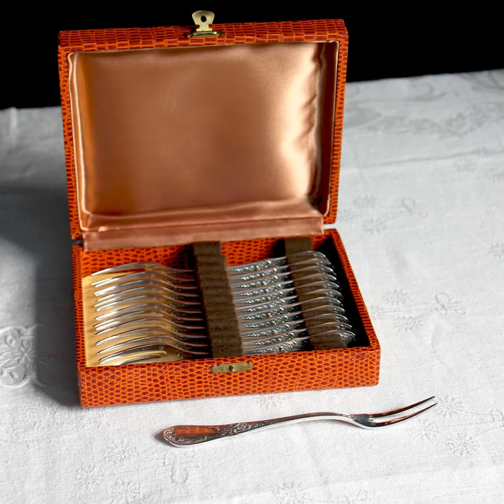 Lot de douze fourchettes à escargots en métal argenté. Manche joliment décoré de volutes et entrelacs. Livrées dans un petit coffret traditionnel.