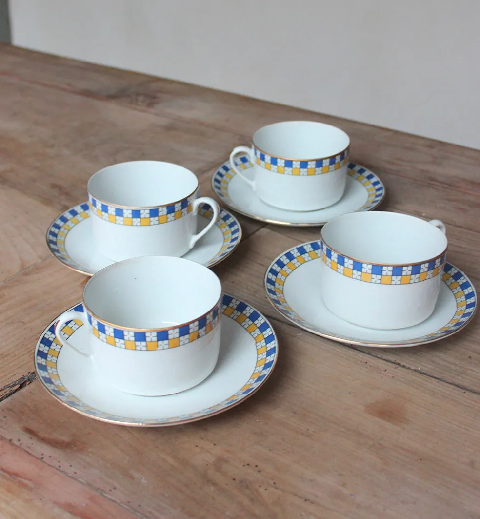 Quatre tasses et leur soucoupe en porcelaine de Limoges. Un délicat damier jaune et bleu borde ce modèle art déco. Format adapté pour un thé, chocolat ou café allongé. Le lot est vendu à 29 euros.