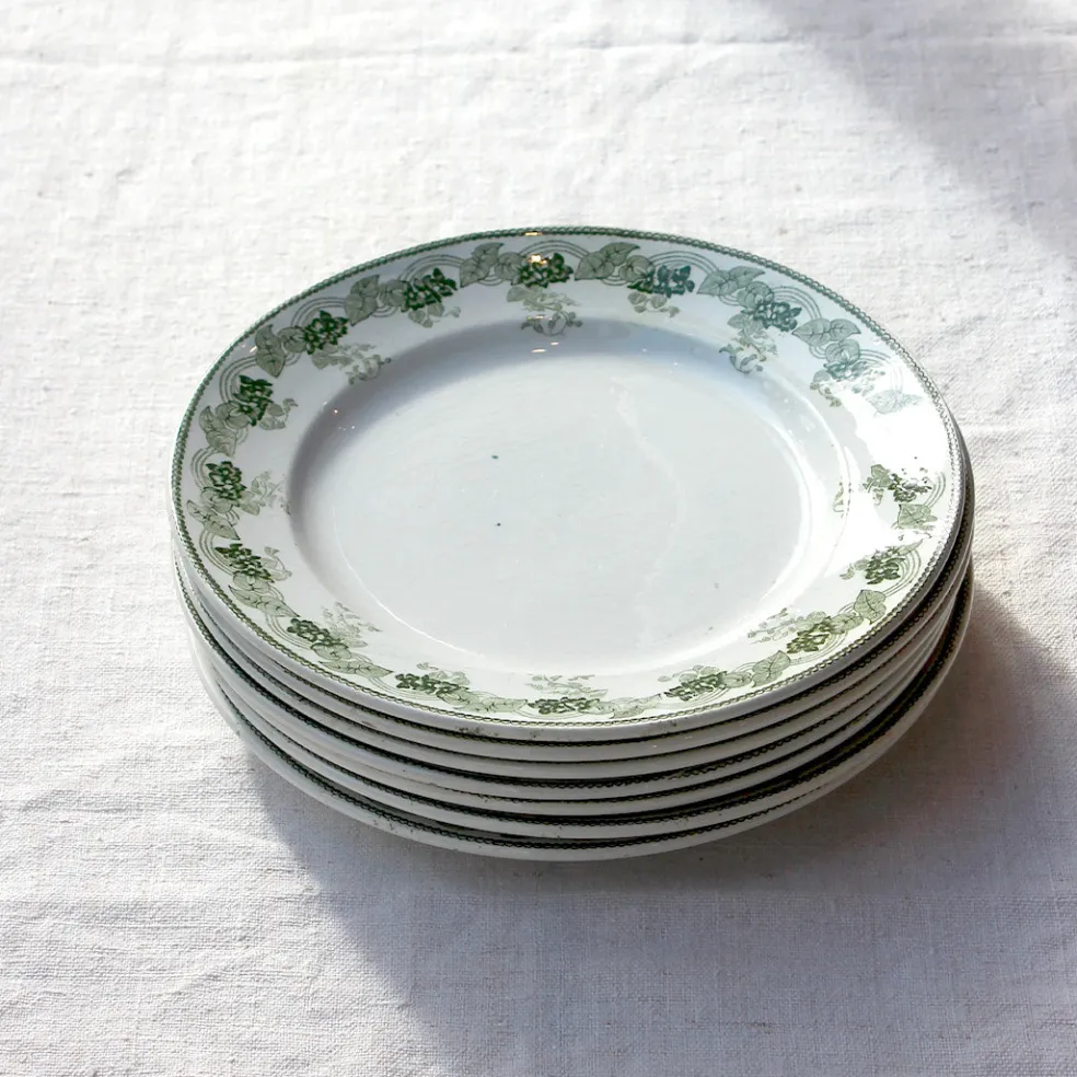 Assiettes à dessert décorées de simples feuilles vert kaki, signées du modèle Violetta de Moulin des Loups.