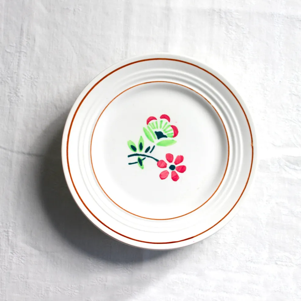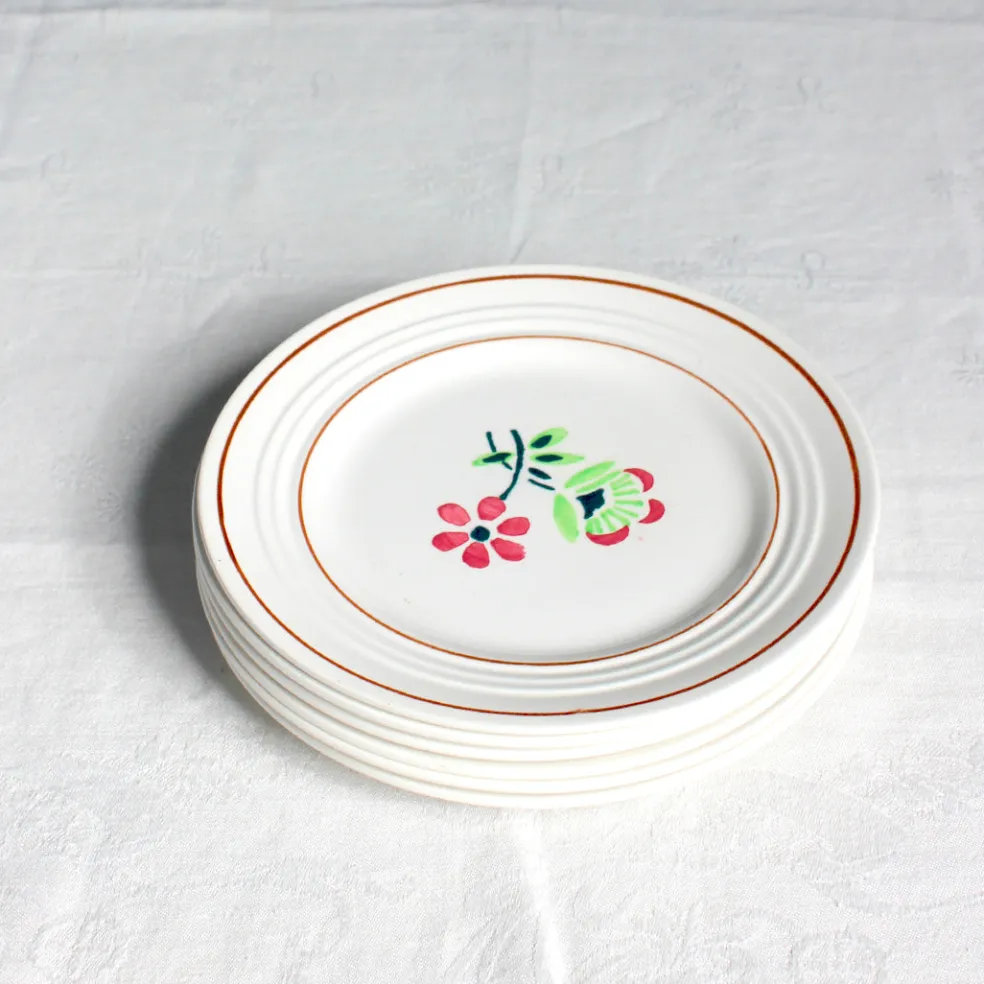 Petites assiettes à dessert fleuri du modèle joyeux et romantique » Gigi » de la manufacture de St Amand.