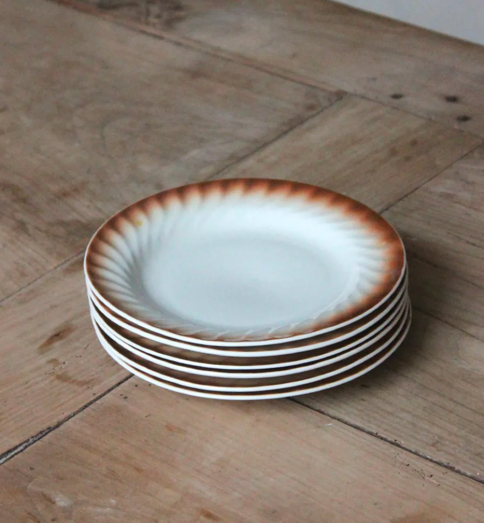 Lot de six assiettes à dessert avec une bordure brune dans un style des années 70. Modèle en porcelaine d’Europe de l’est.