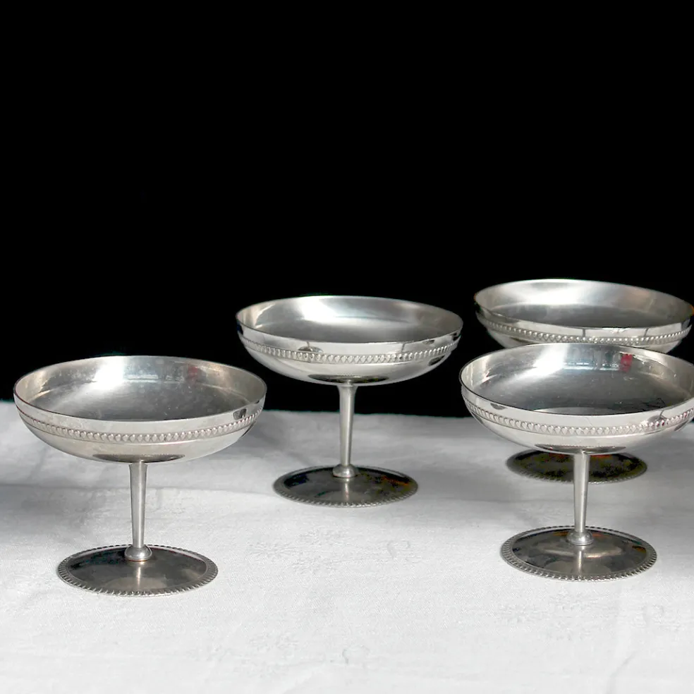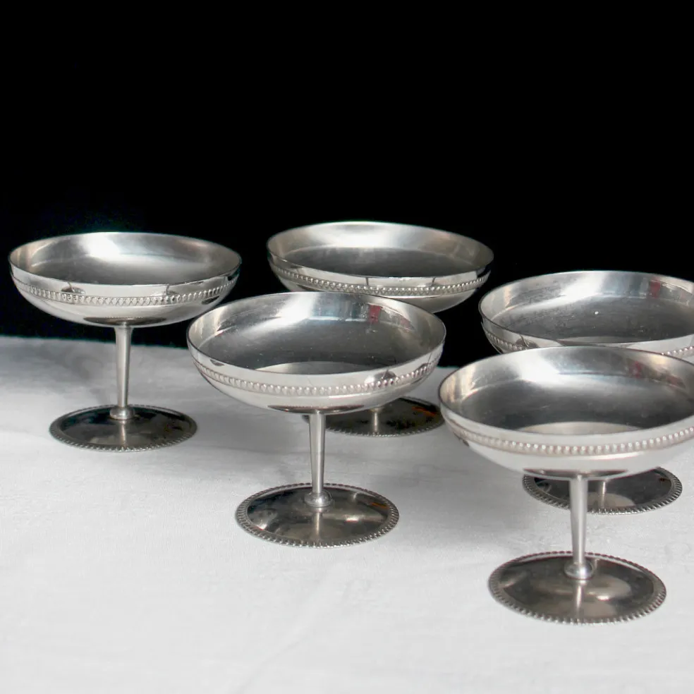 Un ensemble de six coupes sur pied en inox des années 70. Jolis et pratiques pour servir un dessert comme une glace, une salade de fruits ou une mousse au chocolat.
