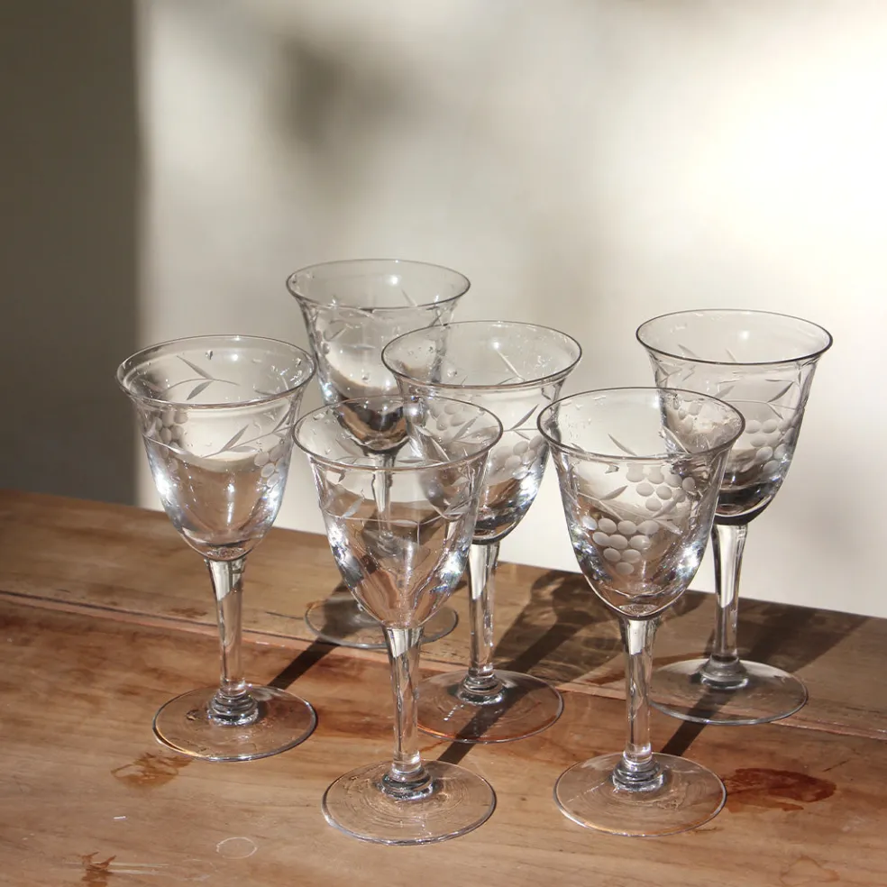 Six petits verres à pied délicatement gravés de fleurs. Taille adaptée pour le service d’un apéritif, d’une liqueur ou de vin blanc.