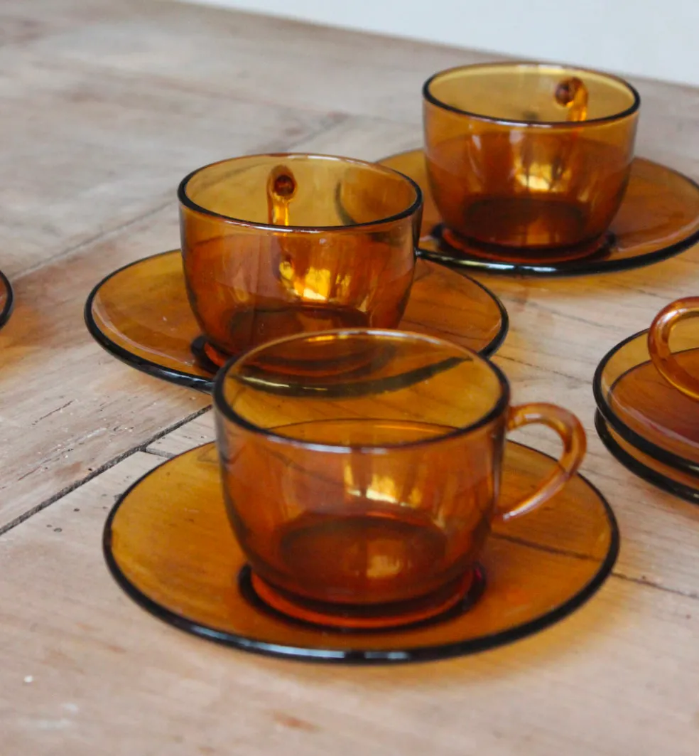 Authentiques tasses et leur soucoupe en verre ambré, l’incontournable des années 70. Le lot de 6 tasses et leur soucoupe est vendu à 30€.