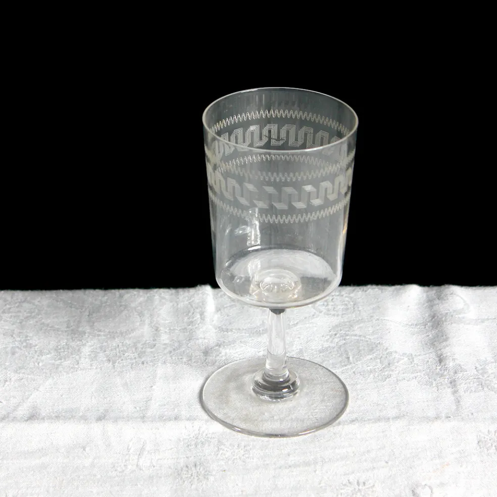 Série de six verres à vin anciens avec un buvant rectangulaire gravé.