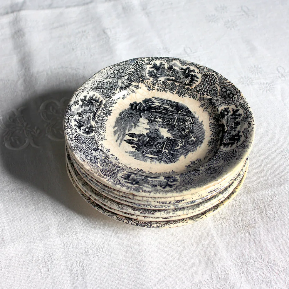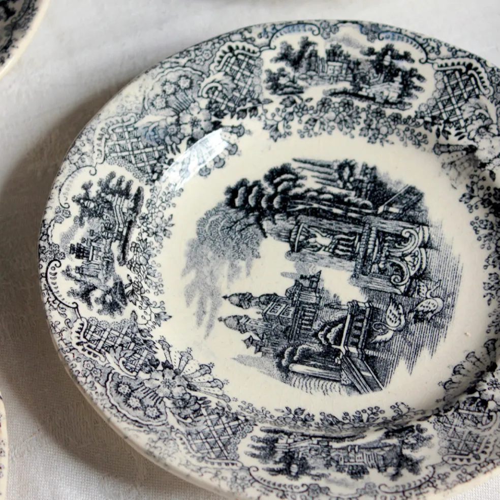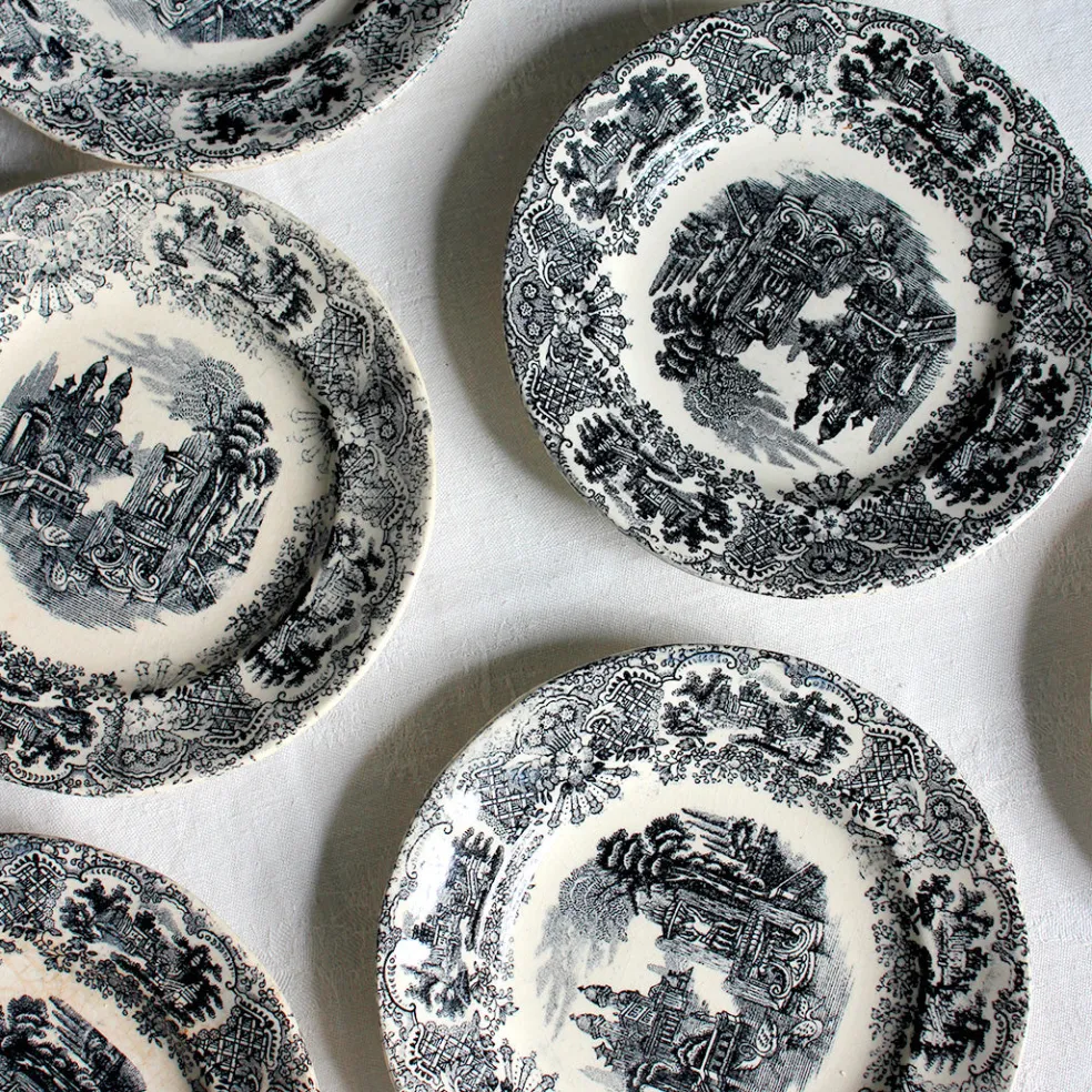 Charmantes assiettes à dessert anciennes avec au centre un décor noir et blanc de la ville de Séville et une bordure finement travaillé. Un modèle d’exception qui date du milieu du XIXème siècle.