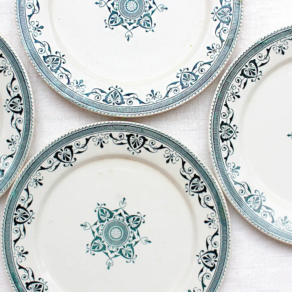 De magnifiques petites assiettes décorées de motifs stylisés verts. Modèle « Amiral » de la manufacture Creil et Montereau.