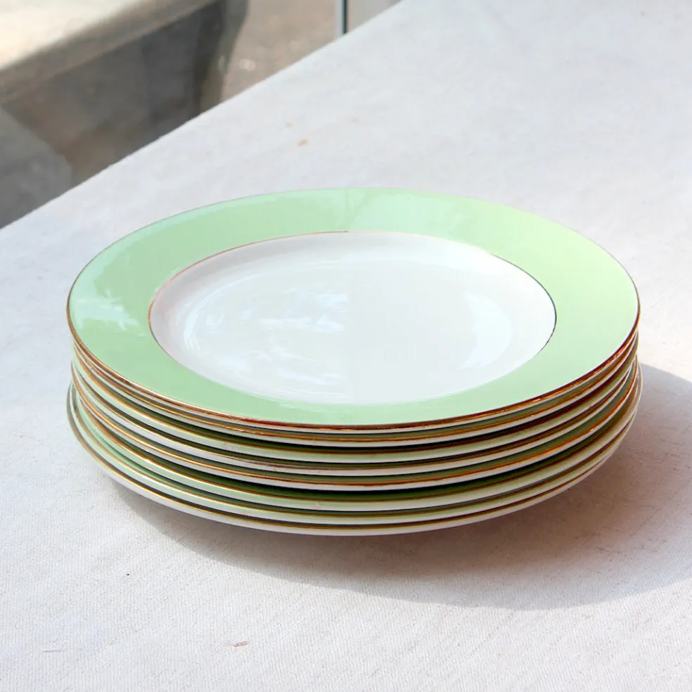 Assiettes plates tout en simplicité cerclées d’une bordure vert d’eau et d’un liseré doré. Modèle estampillé de la manufacture Saint Amandinoise.