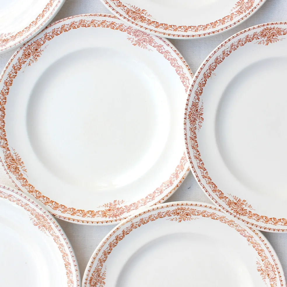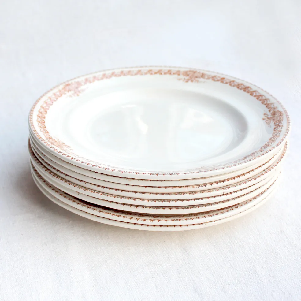 Lot de huit magnifiques assiettes plates en terre de fer décorées d’une frise ocre. Un modèle de Longwy original et intemporel.