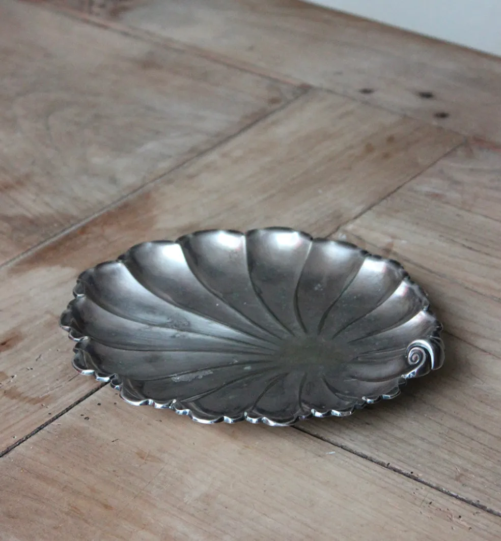Petit coquillage en métal argenté pour servir beurres, terrines, apéritifs et petits condiments. Détail festif sur une table.