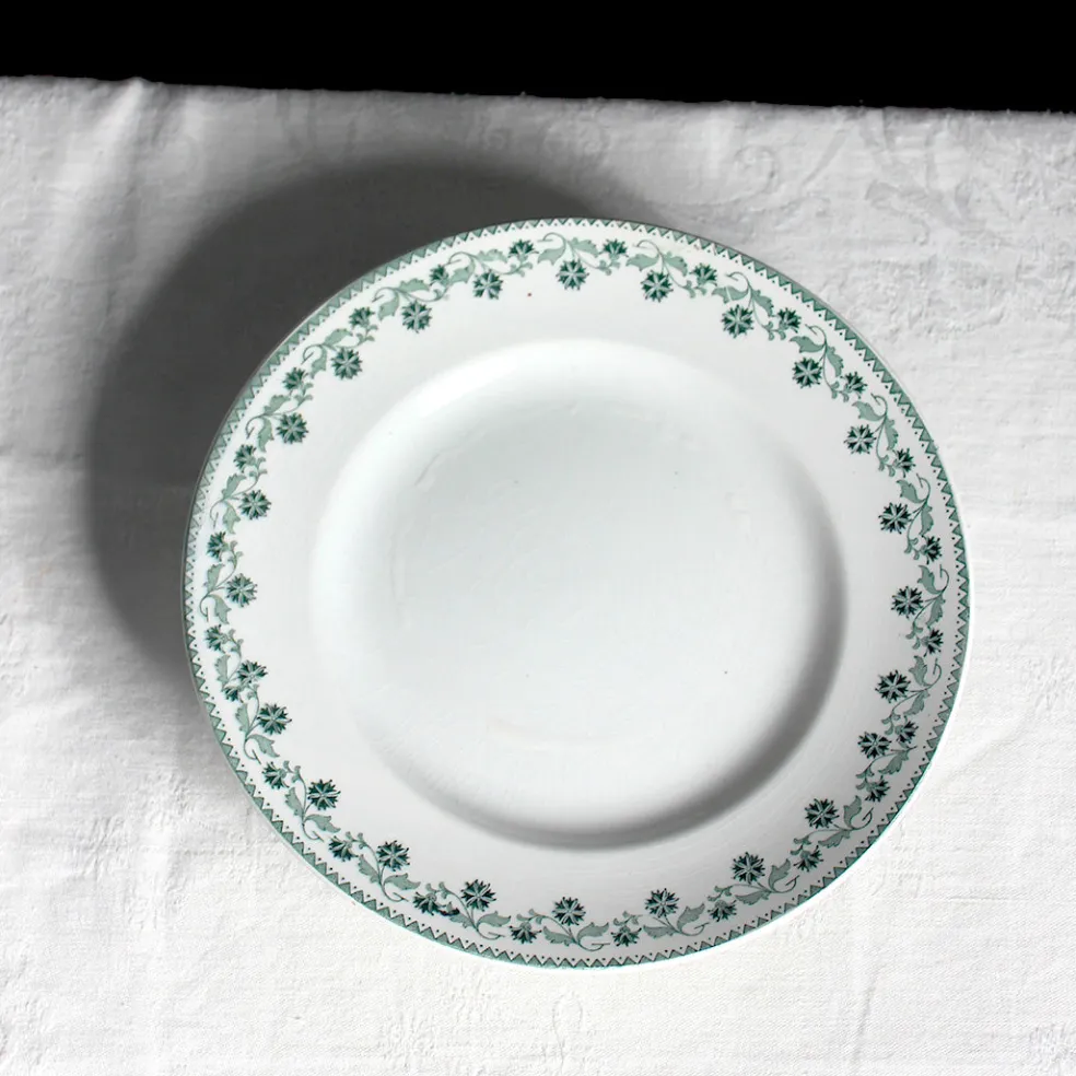 Indémodable assiette sur pied des années 30-50 en terre de fer, bordée d’une frise florale légère vert foncé. Modèle Georgette de la manufacture Moulin des Loups.