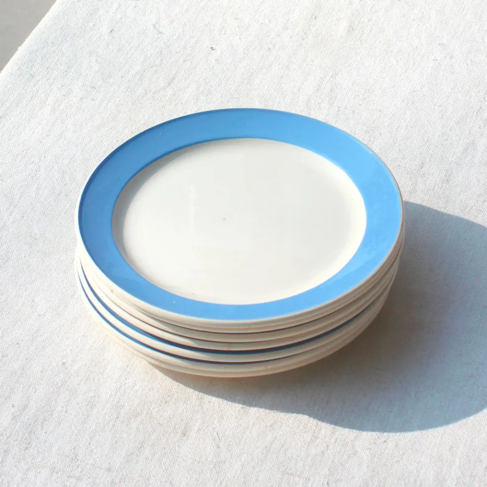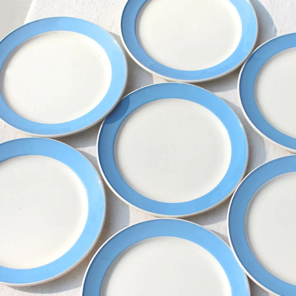 Petites assiettes à dessert en faïence crème cerclée d’un bandeau bleu pervenche. Modèle ‘Orléans’ intemporel et graphique de la manufacture Villeroy and Boch.