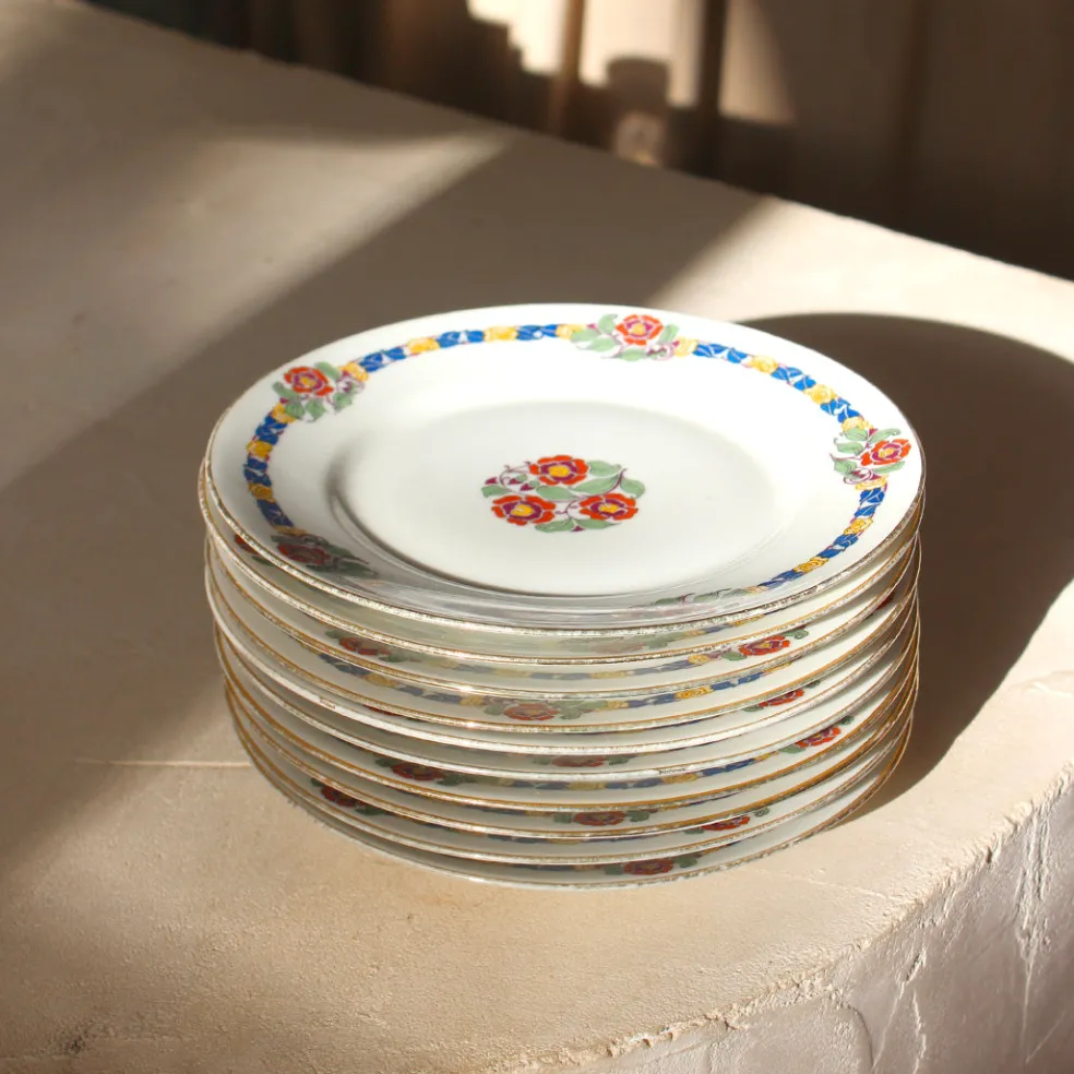 Belle série de dix assiettes à dessert avec une bordure fleurie et un simple liseré doré. Porcelaine fine de Limoges estampillée Jean Boyer.