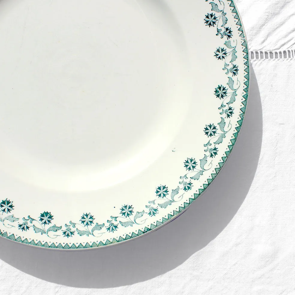 Indémodables assiettes des années 30-50 en terre de fer, bordées d’une frise florale légère vert foncé. Modèle Georgette de la manufacture Moulin des Loups.
