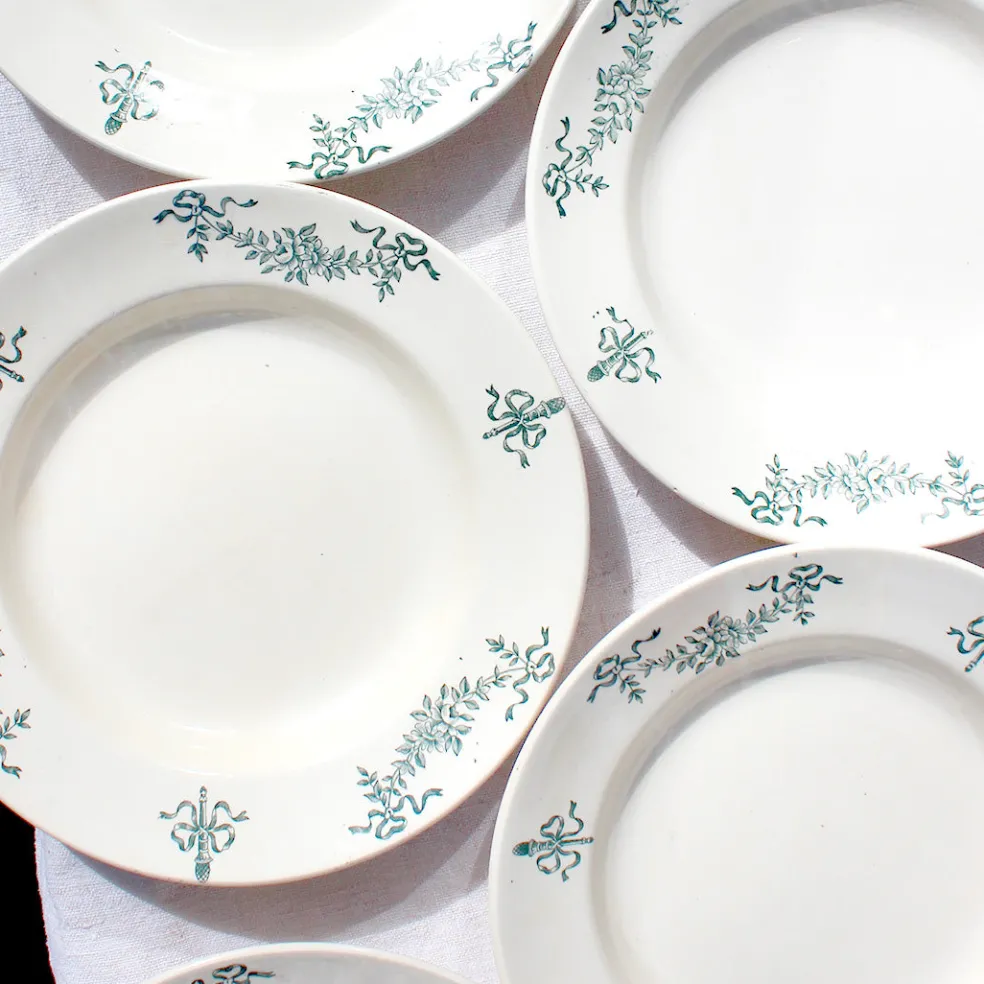 Lot de six grandes assiettes plates et six grandes assiettes creuses de la manufacture de Longchamp typiques du style terre de fer du début du XXème siècle. Des volutes vertes décorent une faïence crème.