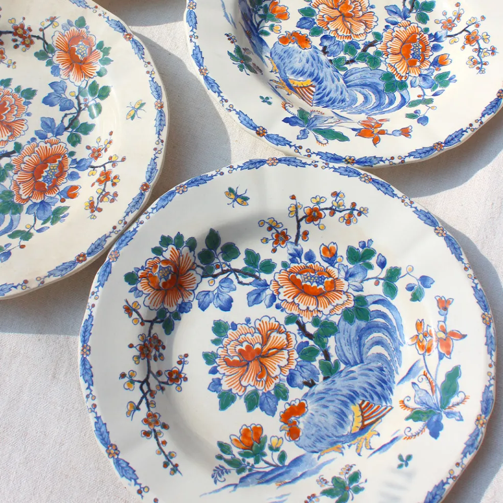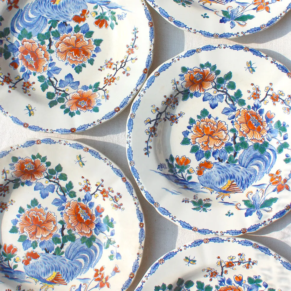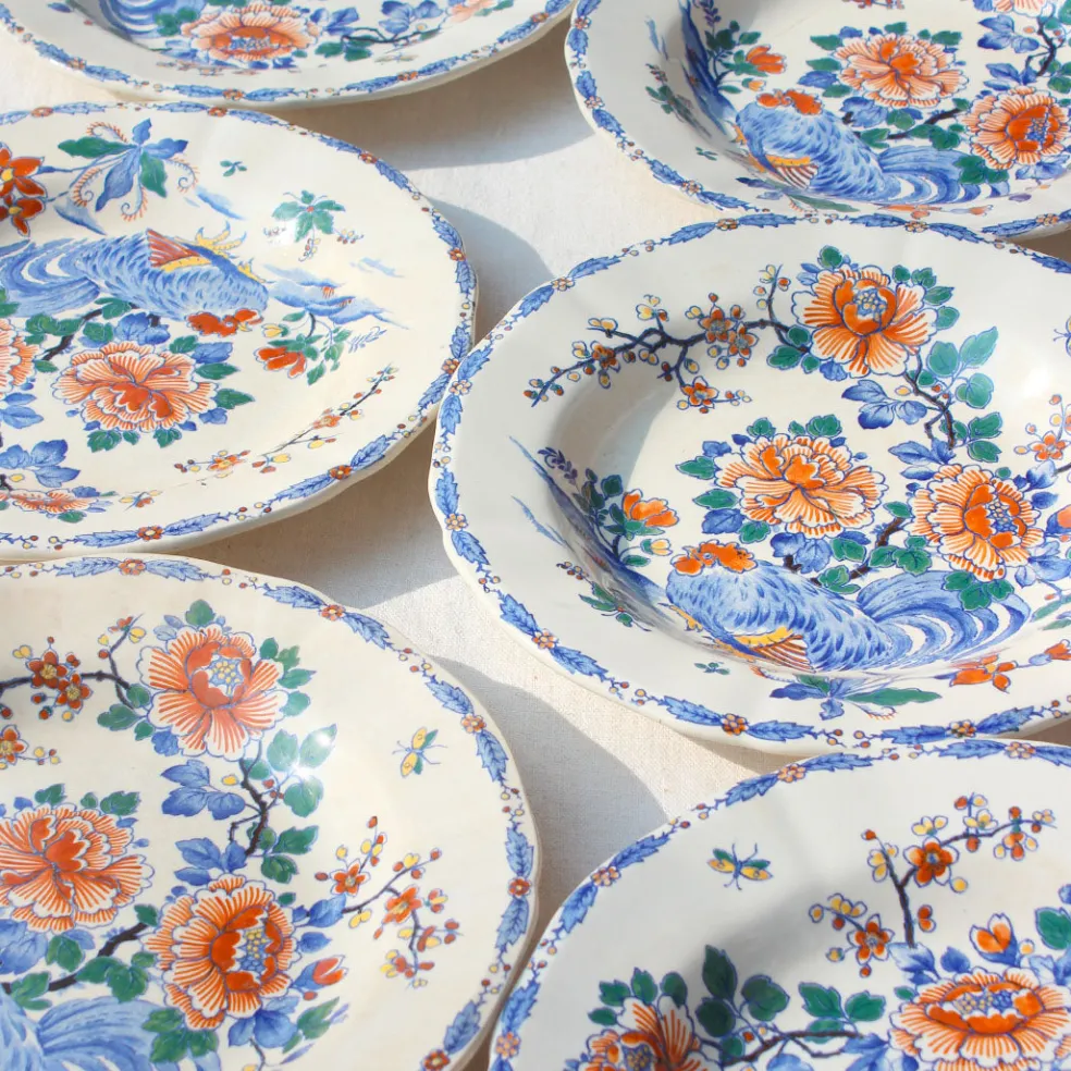 Un magnifique modèle des années 40 couvert de fleurs et d’oiseaux. Une faïence fine de Gien qui habille parfaitement une table printanière et colorée. Plusieurs lots de grandes assiettes plates, d’assiettes semi-creuses ainsi que de petites assiettes à dessert sont disponibles.