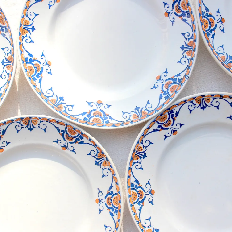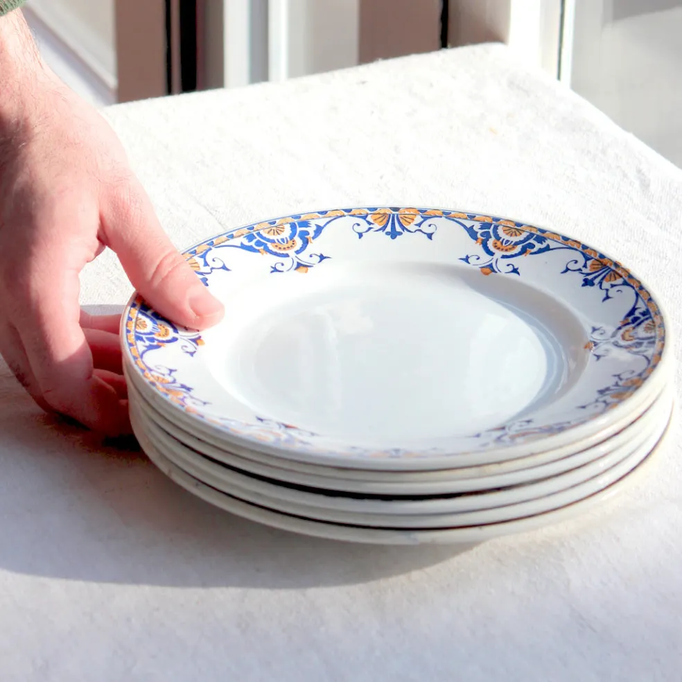 Série d’assiettes en faïence blanche décorée de motifs géométriques ocre et bleu, années 30. Modèle Saint Cast de la manufacture Moulin des Loups.
