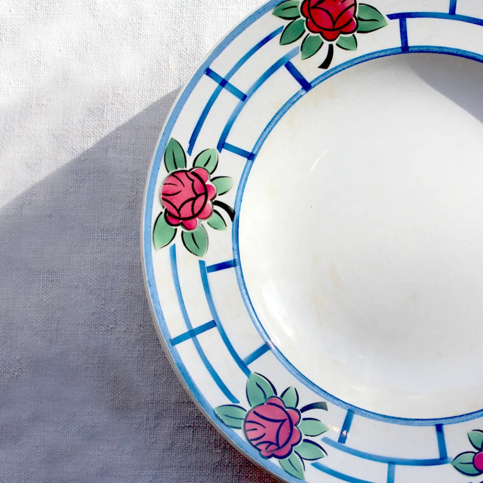 Belle série d’assiettes plates, semi-creuses et creuses, en faïence blanche décorée de fleurs stylisées. Un style art déco joyeux et facile à dépareiller avec une vaisselle contemporaine.