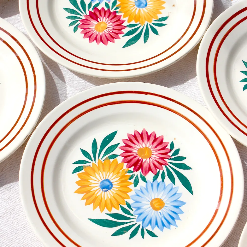 Un modèle coup de coeur de la manufacture Choisy-le-Roi qui date d’entre les années 20 et les années 50. Trois grosses fleurs colorées recouvrent le fond de l’assiette encadrées par de fines rayures. Format moyen de 23cm, typique des assiettes anciennes.