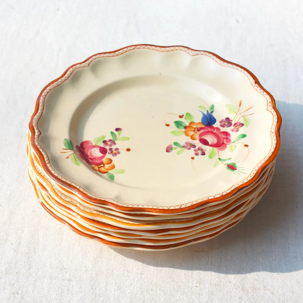 Bords festonnés, couleurs chaudes et coup de pinceau assumé pour ce modèle Monaco de la manufacture de Longchamp. Plusieurs lots d’assiettes ainsi que des plats de service sont disponibles sur notre site.