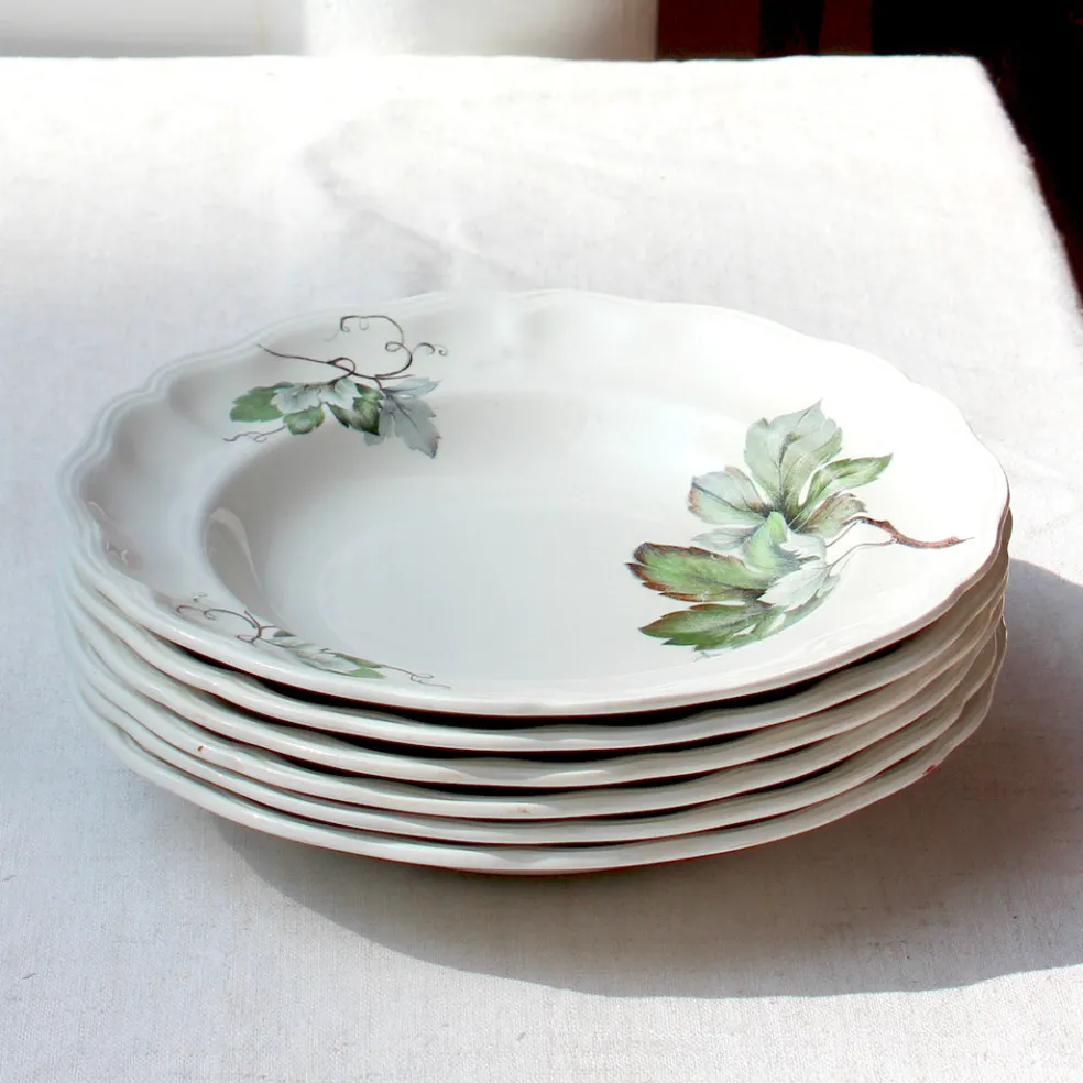 Grande série d’assiettes plates en faïence blanche décorées de feuillages. Bords mouvementés. Diamètre de 25cm.