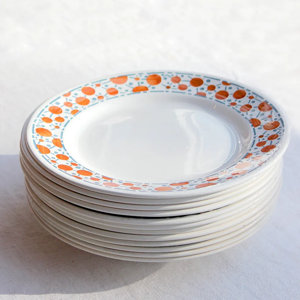 Assiettes plates et creuses des années 30 avec un bandeau original orange et gris. Modèle Denise de la manufacture de Givors.