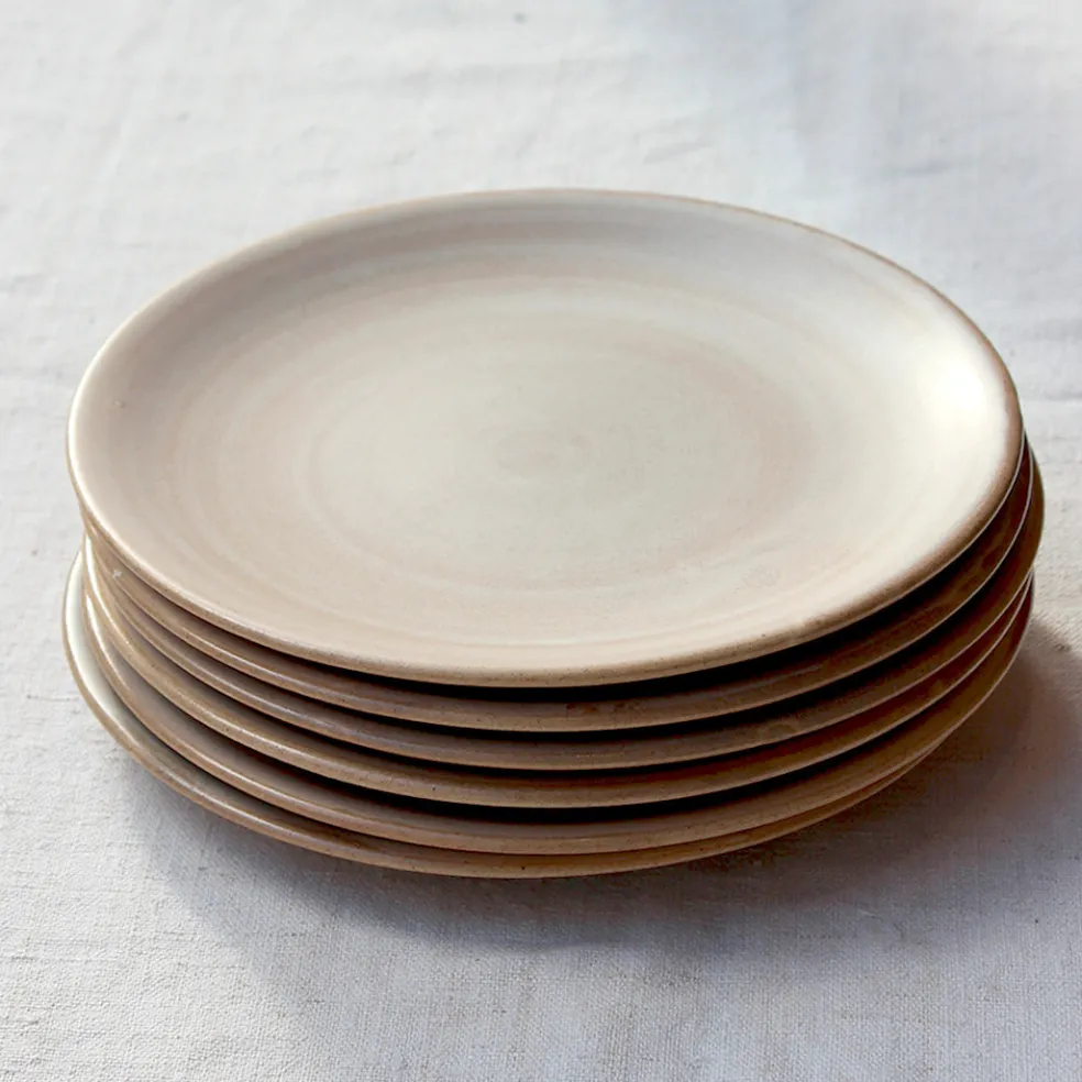 Toucher et style inimitable du grès beige pour cette grande série d’assiettes plates, creuses et à dessert de la manufacture de Niderviller.