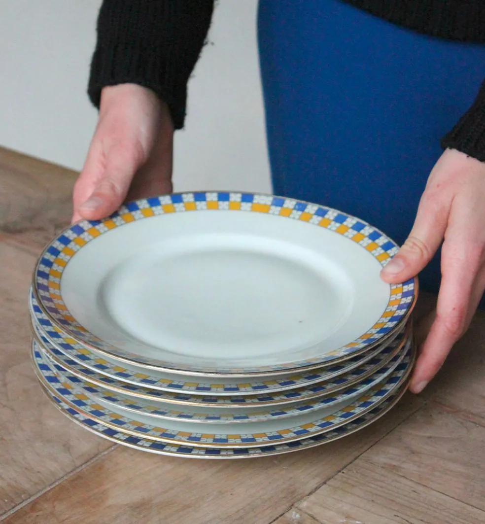 Assiettes plates et creuses en porcelaine de Limoges. Un délicat damier jaune et bleu borde ce modèle art déco.
