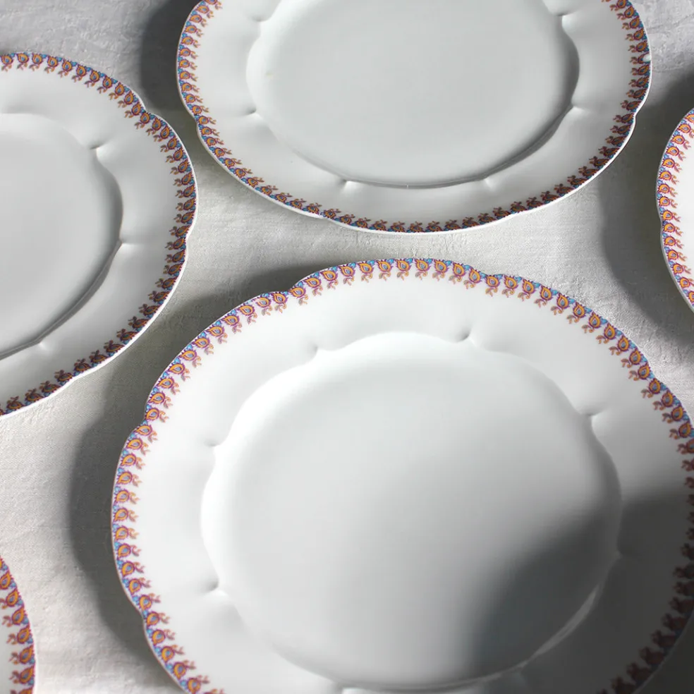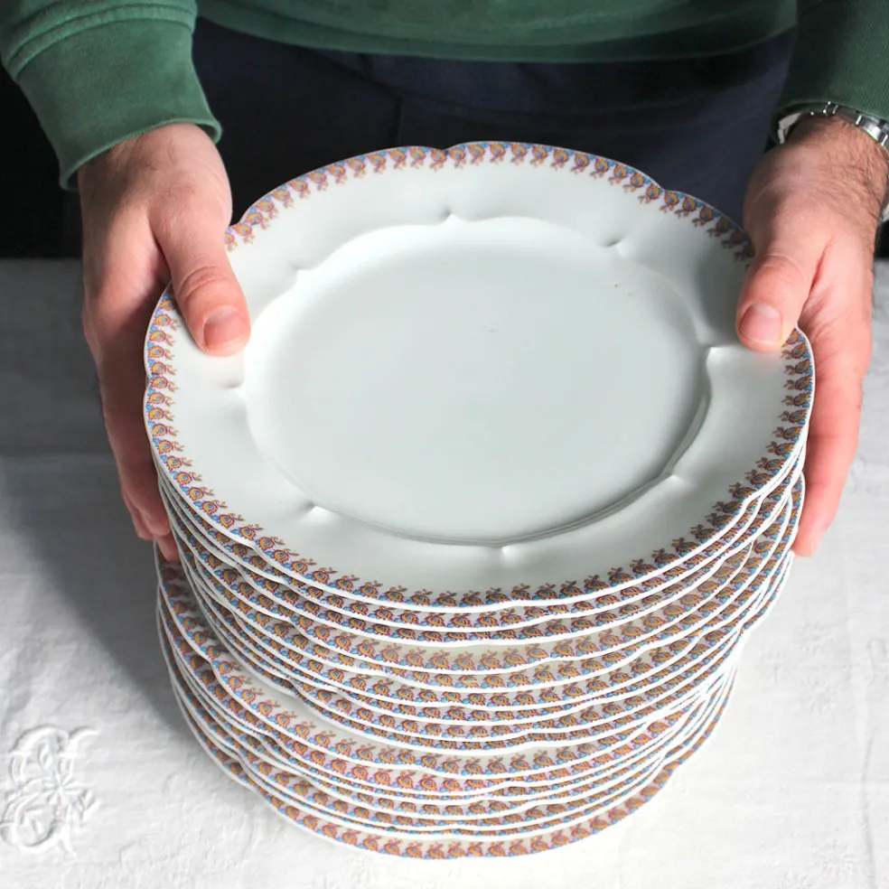 Très belle série d’assiettes en porcelaine blanche, les bords sont légèrement mouvementés et décorés d’une fine frise colorée. Un modèle en édition limitée créé pour les grands magasins de Châteauroux.