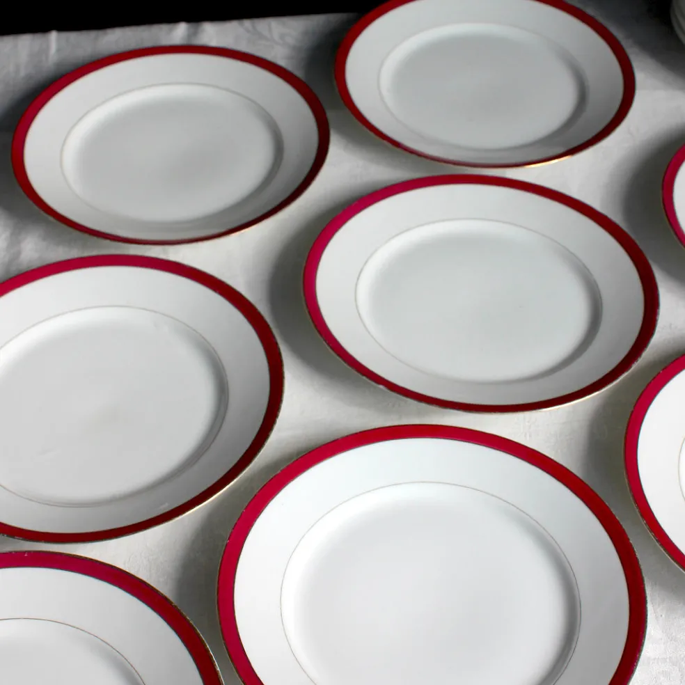 Belle série d’assiettes plates avec une bordure épaisse rouge framboise. Une porcelaine fine de Limoges, modèle déposé rue Étienne Marcel à Paris.