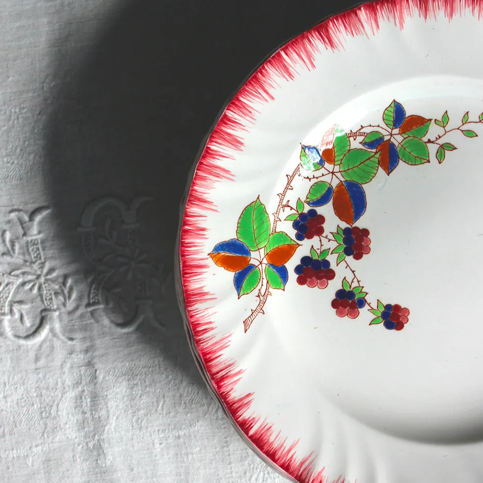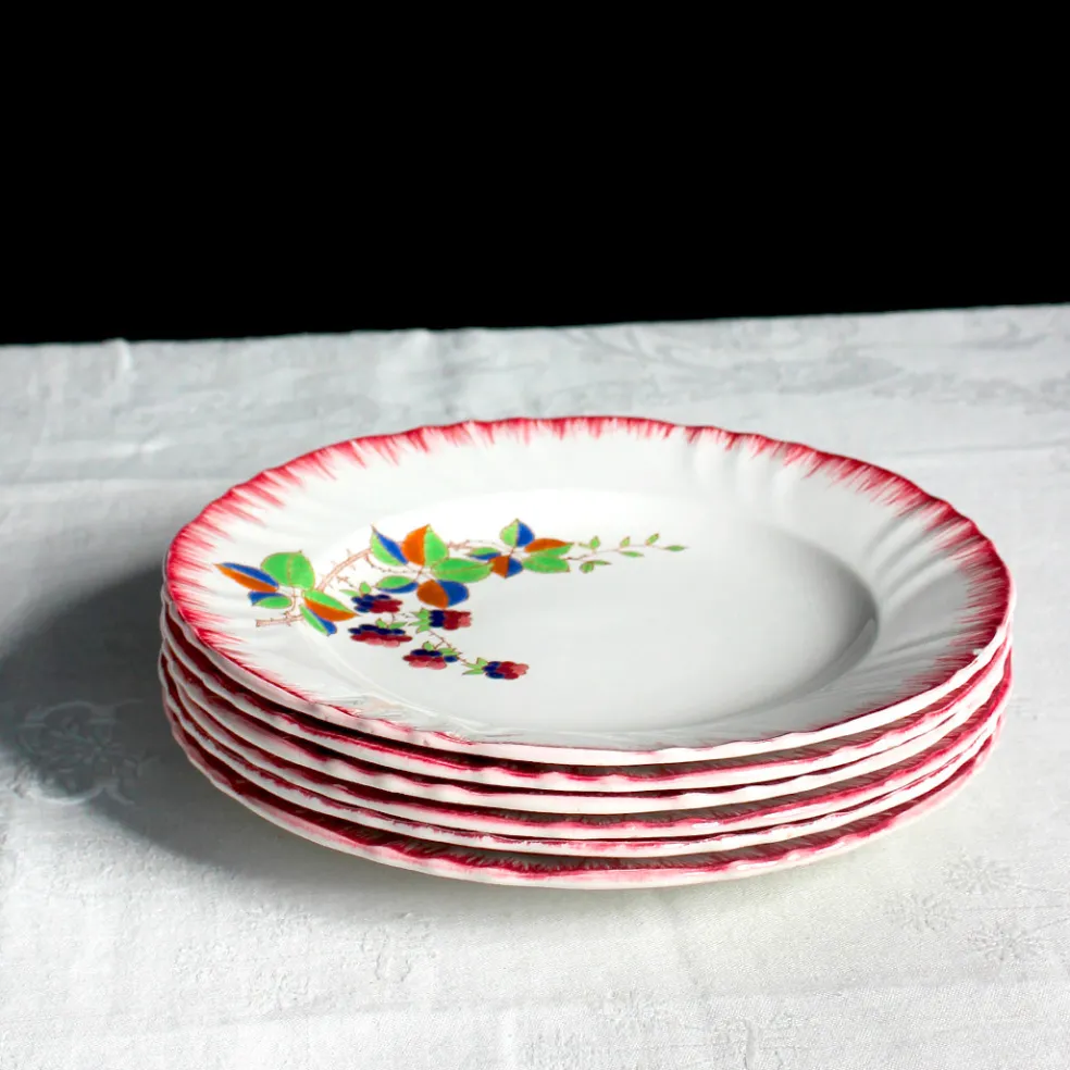 Magnifique série de Longwy intitulée « Automne » caractérisée par un décor en grappe asymétrique en relief et des bords peignés framboise. Des assiettes plates, creuses et à dessert sont disponibles. Plusieurs lots de six assiettes sont disponibles.