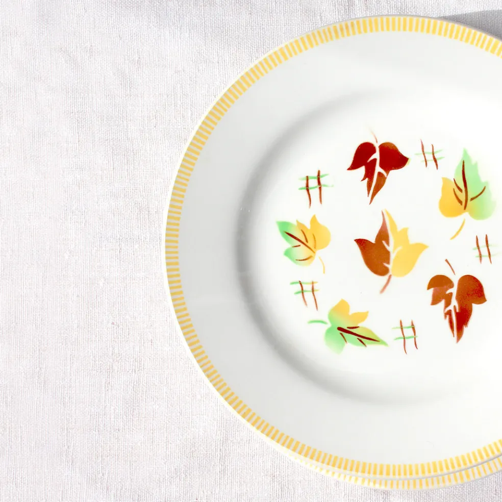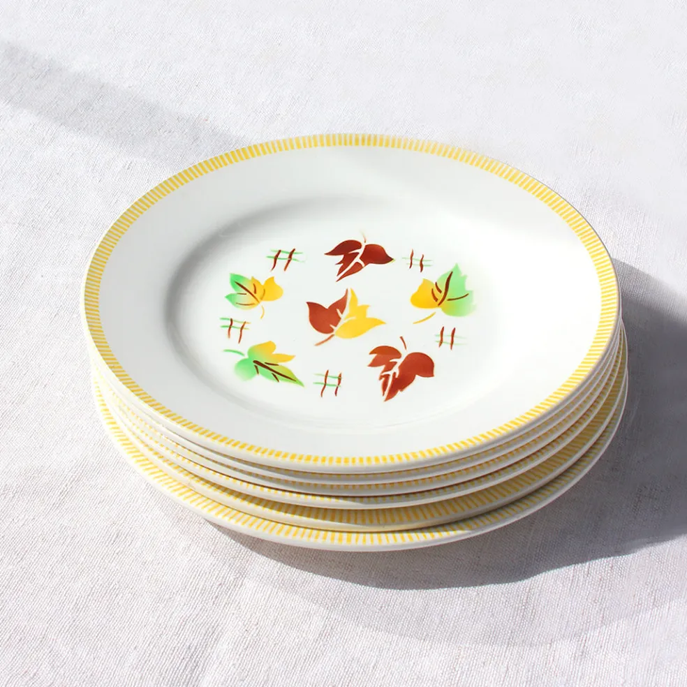 Des assiettes originales de Digoin, décorées de feuilles multicolores dans un esprit automnal. Les assiettes sont vendues par six. Plusieurs lots sont disponibles.