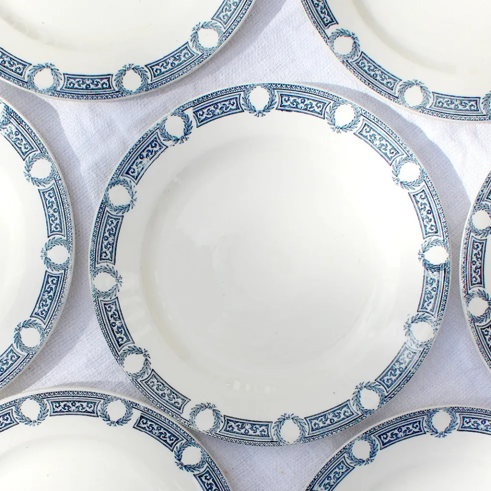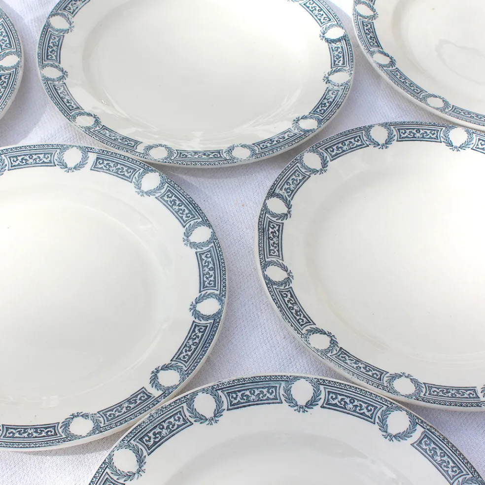 Magnifiques assiettes anciennes couleur ivoire cerclées d’un bandeau bleu encre. Un intemporel de la manufacture Salins.