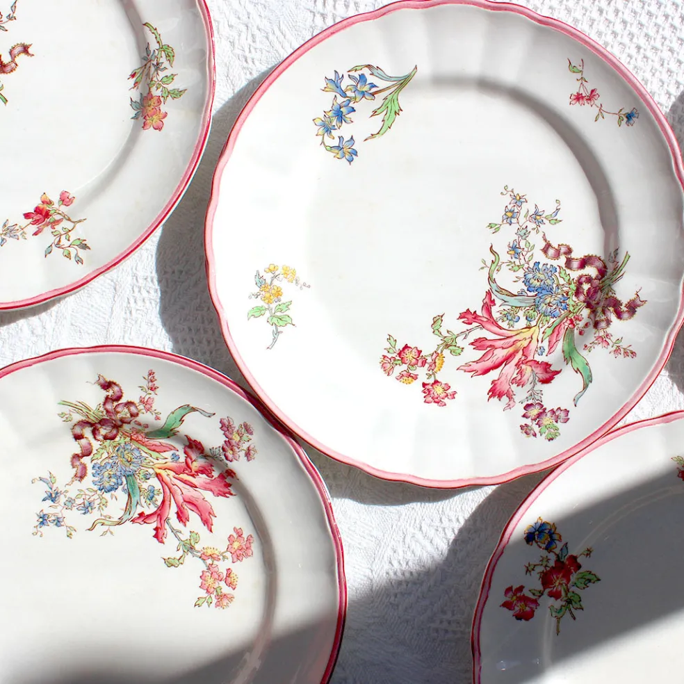 Assiettes plates et creuses en terre de fer ornées de feuillages dispersés aux couleurs chaudes et liseré rose fuchsia. Ce décor peint à la main varie d’une assiette à l’autre. Au dos est inscrit « A la paix avenue de l’Opéra », adresse incontournable de vaisselle à Paris au début du XXème siècle.