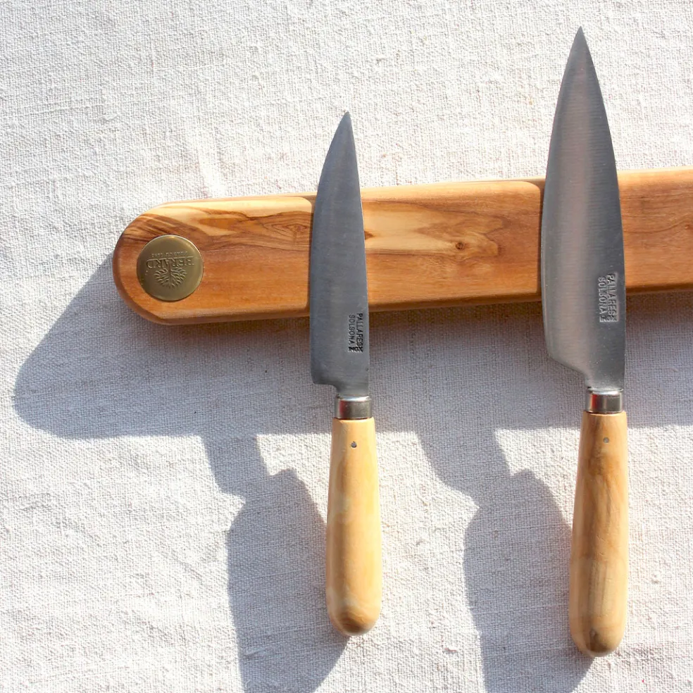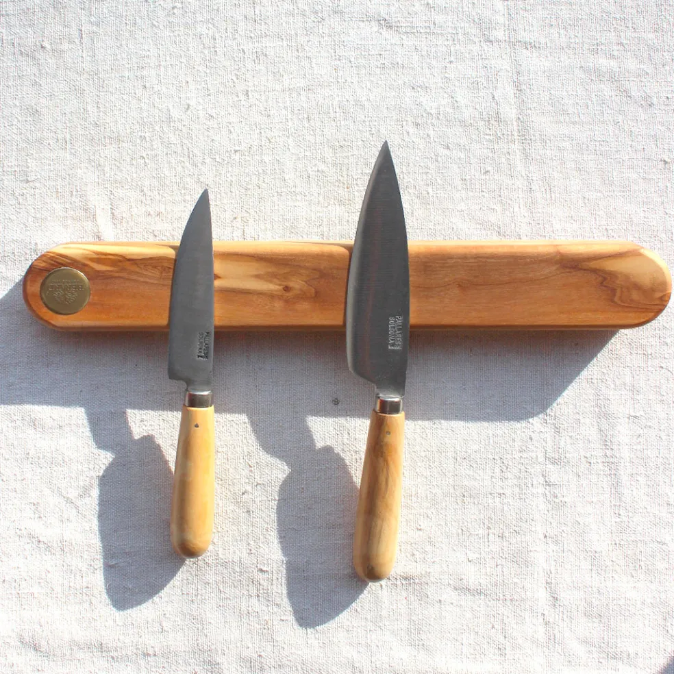 Une barre aimantée pour couteaux de cuisine en bois d’olivier massif. Elle mesure 32cm ce qui permet d’avoir à disposition cinq à six couteaux. Son système d’accroche avec deux vis est simple, discret et pratique. Ce système magnétique permet de préserver le tranchant de vos couteaux et de les saisir en toute sécurité.