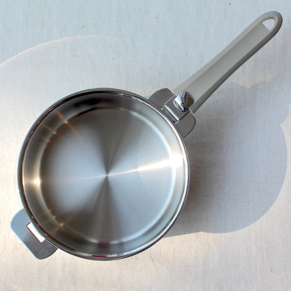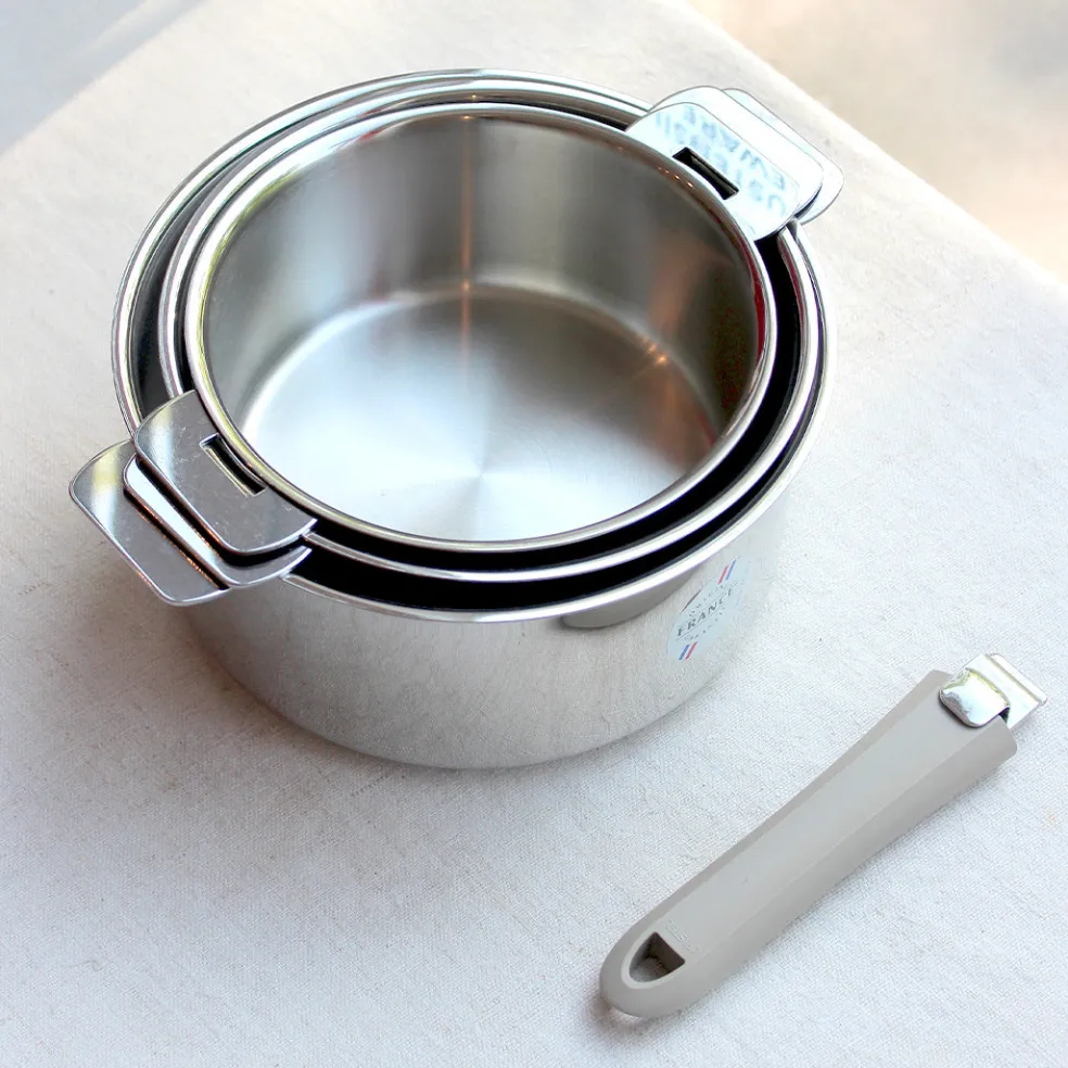 Batterie de casseroles en inox haut de gamme avec poignée amovible de la gamme Mutine de Cristel.