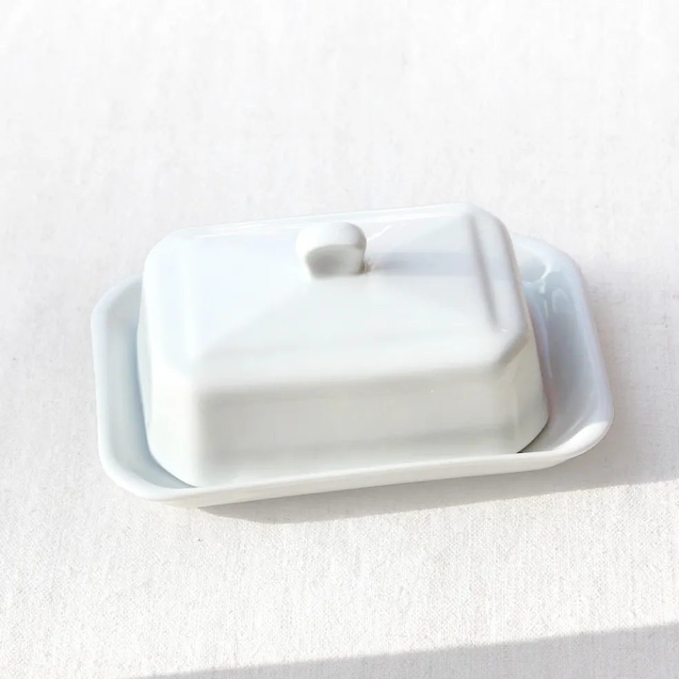 Beurrier à cloche en porcelaine blanche permettant de conserver et servir le beurre. Ce modèle intemporel et élégant, de taille moyenne, est adapté aux mottes de beurre de 300g.