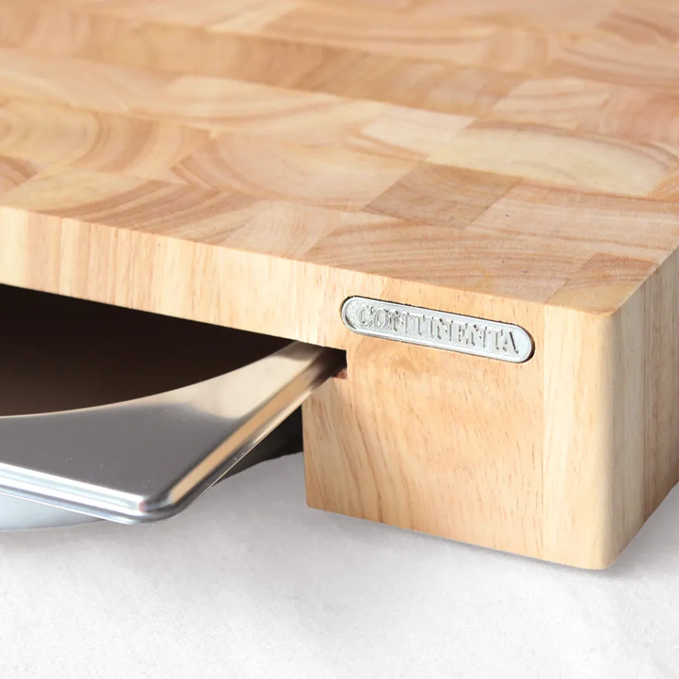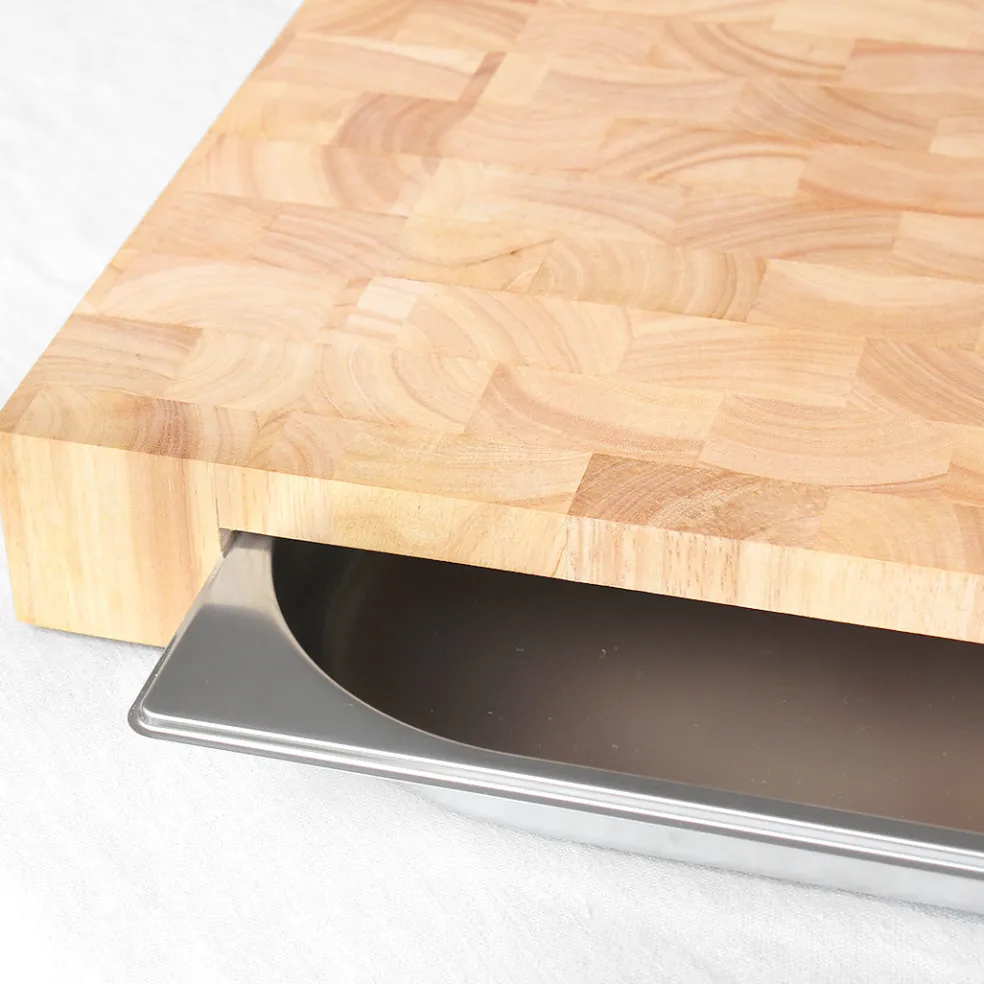 Grande planche en bois d’hévéa marquetée à la façon des billots de bouchers. Ses dimensions, son épaisseur et ses pieds antidérapants le rendent adapté à un usage permanent, en plan de travail. Le réceptacle tiroir en inox permet de réserver les préparations ou les épluchures. Un accessoire essentiel, à la fois pratique et esthétique.