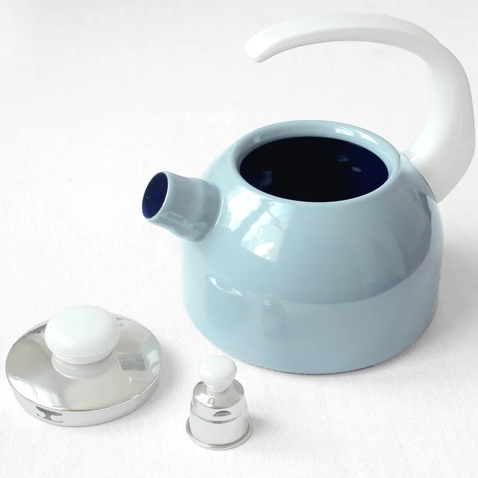 Traditionnelle bouilloire en acier émaillé, équipée d’un sifflet pour prévenir lorsque l’eau bout. Compatible avec tous les types de feux (gaz, électrique, vitrocéramique et induction).