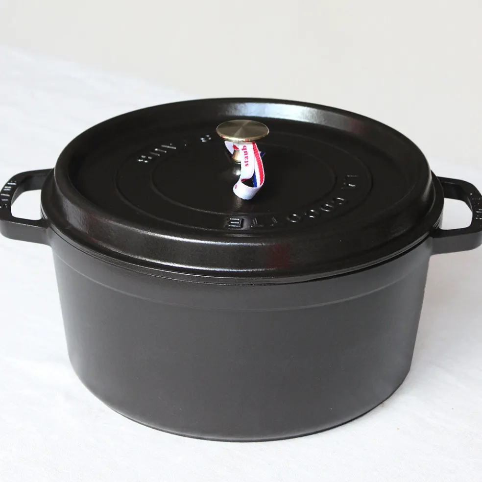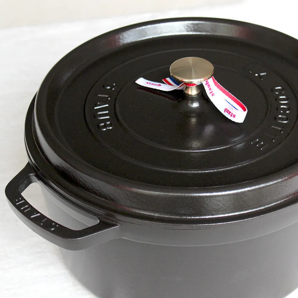 La traditionnelle cocotte en fonte noire, ici dans un format rond, qui permet une cuisson douce d’une grande variété de plats mijotés. Son couvercle innovant à picots permet de retenir l’humidité et de répartir la condensation de manière homogène afin d’arroser parfaitement vos préparations en cours de cuisson. L’intérieur émaillé noir résiste aux rayures mais surtout est idéal pour saisir et rôtir certains légumes et pièces de viandes. Compatible avec tous les types de feux (gaz, électrique, vitrocéramique et induction) mais également avec une cuisson au four ( jusqu’à 200°). Un incontournable de la cuisine française à adopter pour la vie.