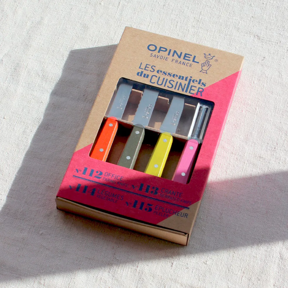 Coffret de petits couteaux de cuisine de la célèbre maison Opinel composé d’un couteau d’office, d’un couteau cranté, d’un éplucheur et d’un couteau bec d’oiseau. Manches en bois de hêtre colorés et vernis.