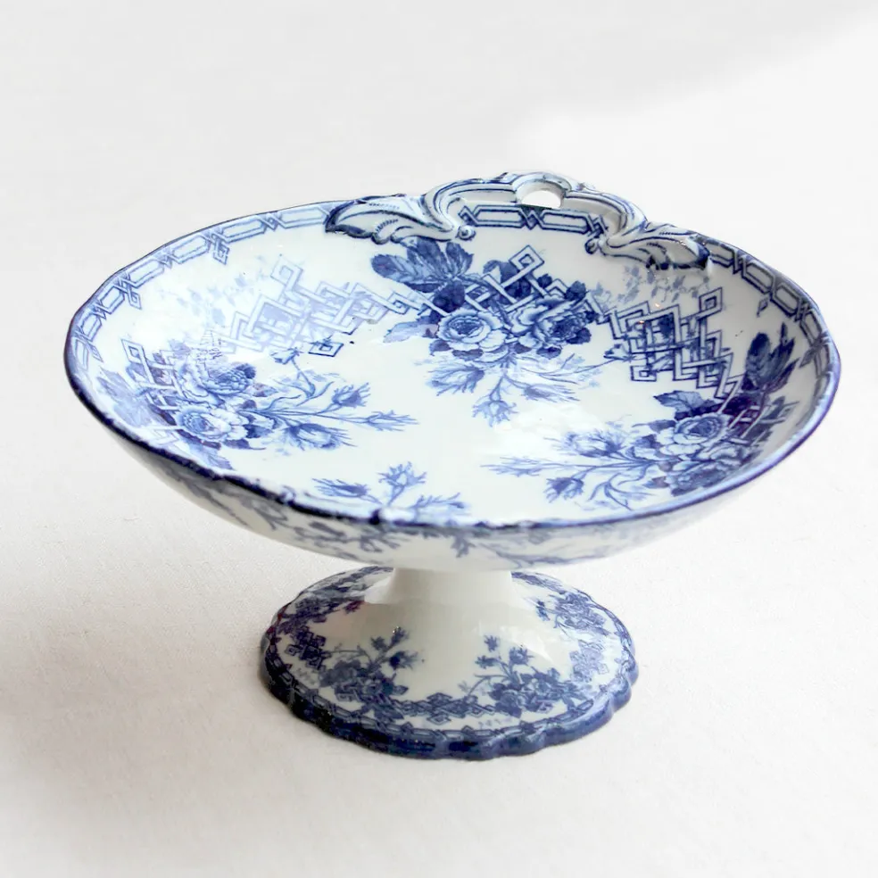 Un décor travaillé de fleurs bleues orne ce compotier du XIXème siècle. Une pièce d’exception pratique pour présenter des fruits ou des gâteaux à table ou sur un comptoir.