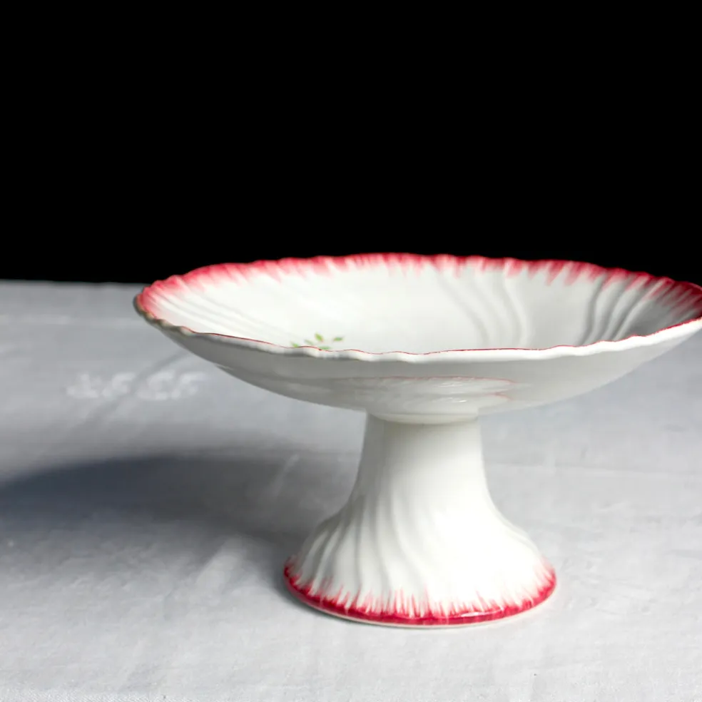 Compotier de la série de Longwy intitulée « Automne » caractérisée par un décor en grappe asymétrique en relief et des bords peignés framboise.
