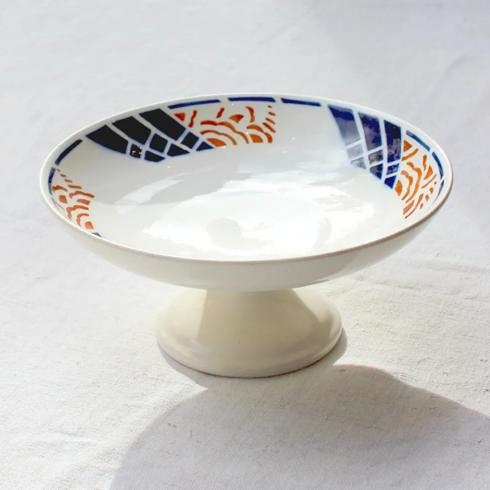 Compotier en faïence aux motifs géométriques bleu marine et ocre. Un modèle rare et percutant, caractéristique du style art déco, nommé Gaby.