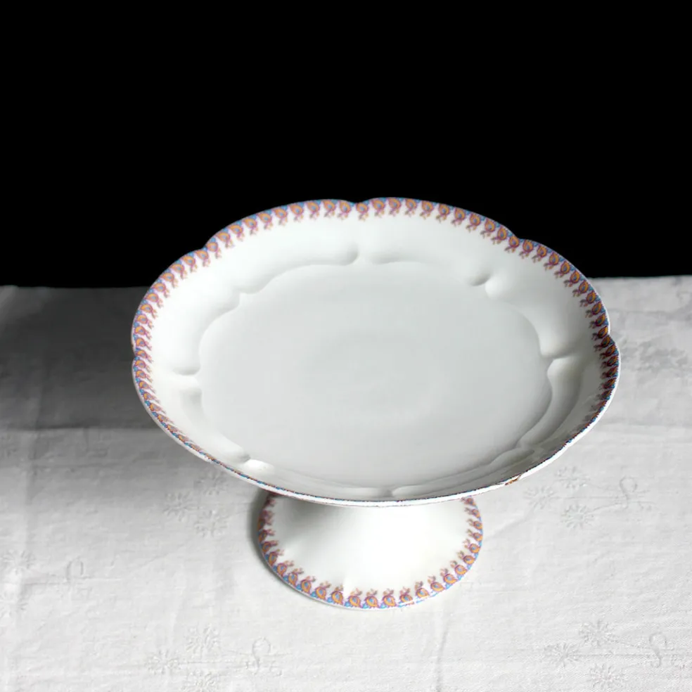 Assiette sur pied et Grand compotier en porcelaine blanche, les bords sont légèrement mouvementés et décorés d’une fine frise colorée. Un modèle en édition limité créé pour les grands magasins de Châteauroux.