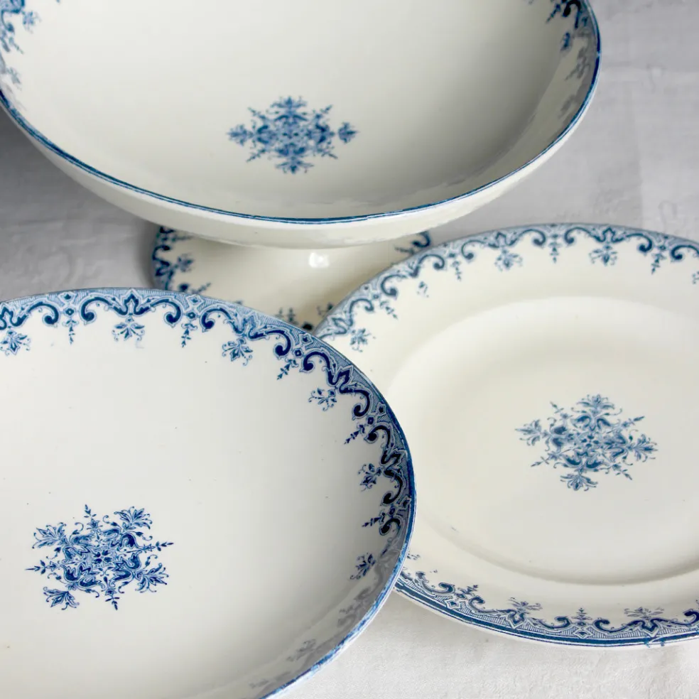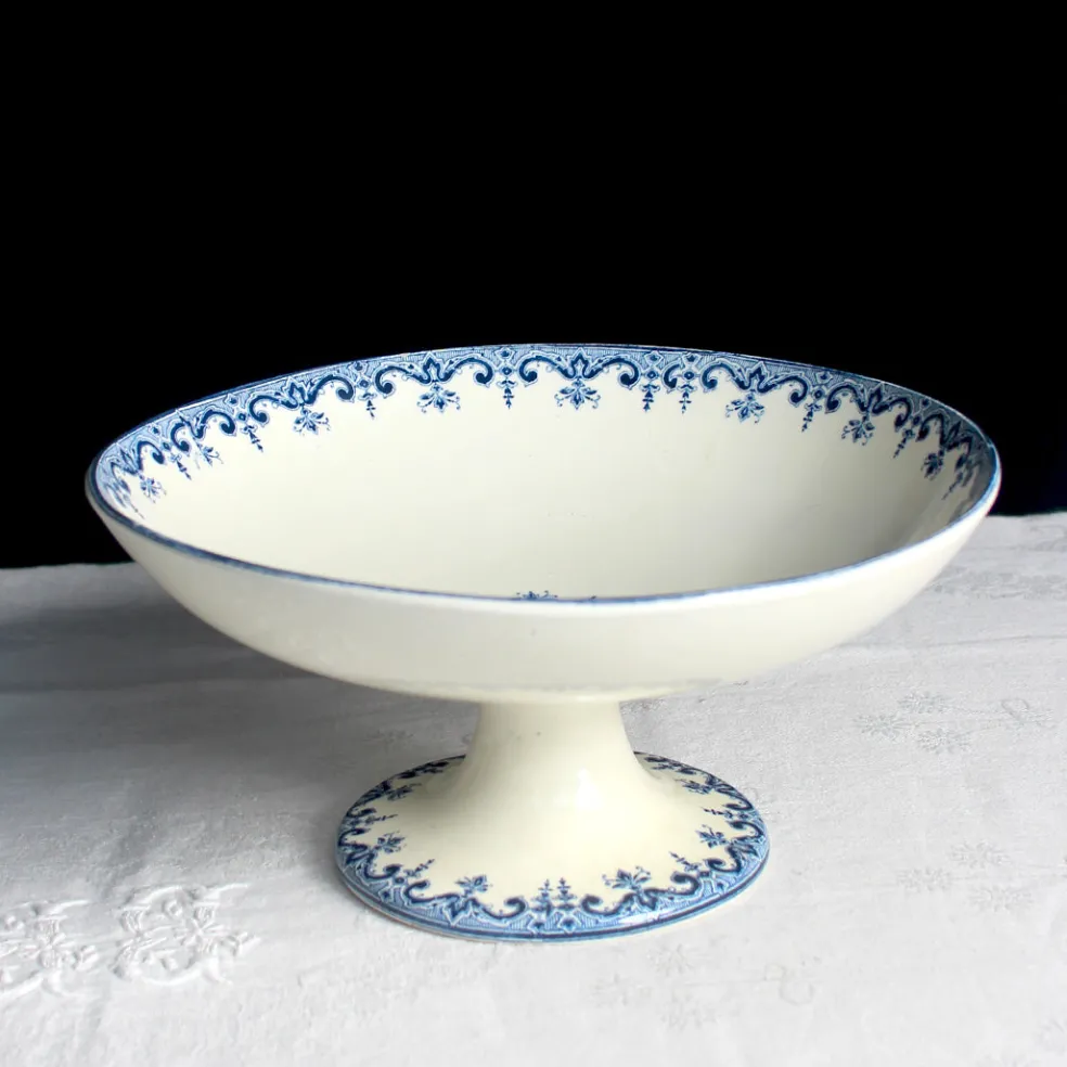 Série de compotiers et assiette sur pied ornés d’une frise aux volutes bleu marine de la manufacture de Clairefontaine. L’estampille « LG », indique que le modèle date de la période 1894-1913.
