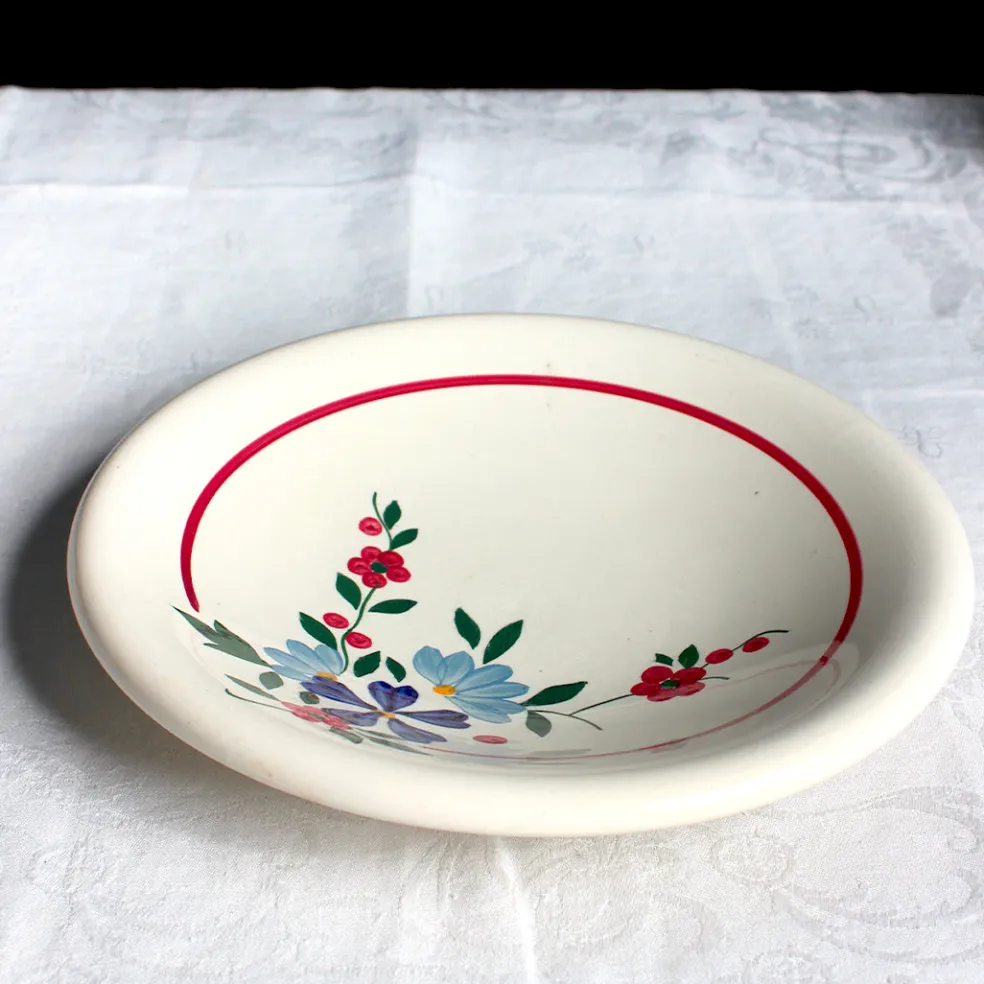 Grande coupe sur pied en faïence crème avec un décor de fleurs asymétrique peint à la main, signée Sarreguemines. Un détail rétro dans une cuisine ou à table pour présenter des fruits.